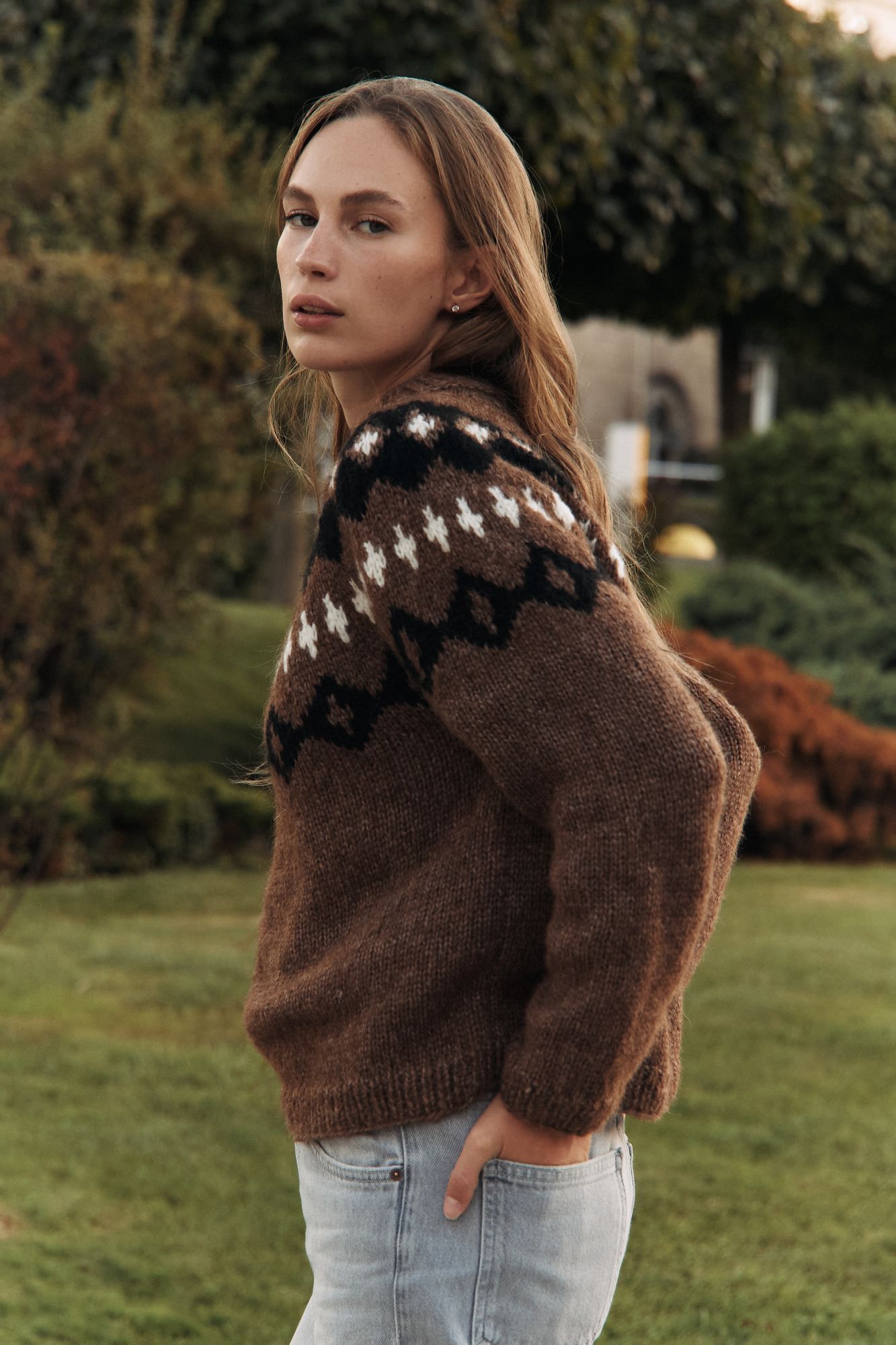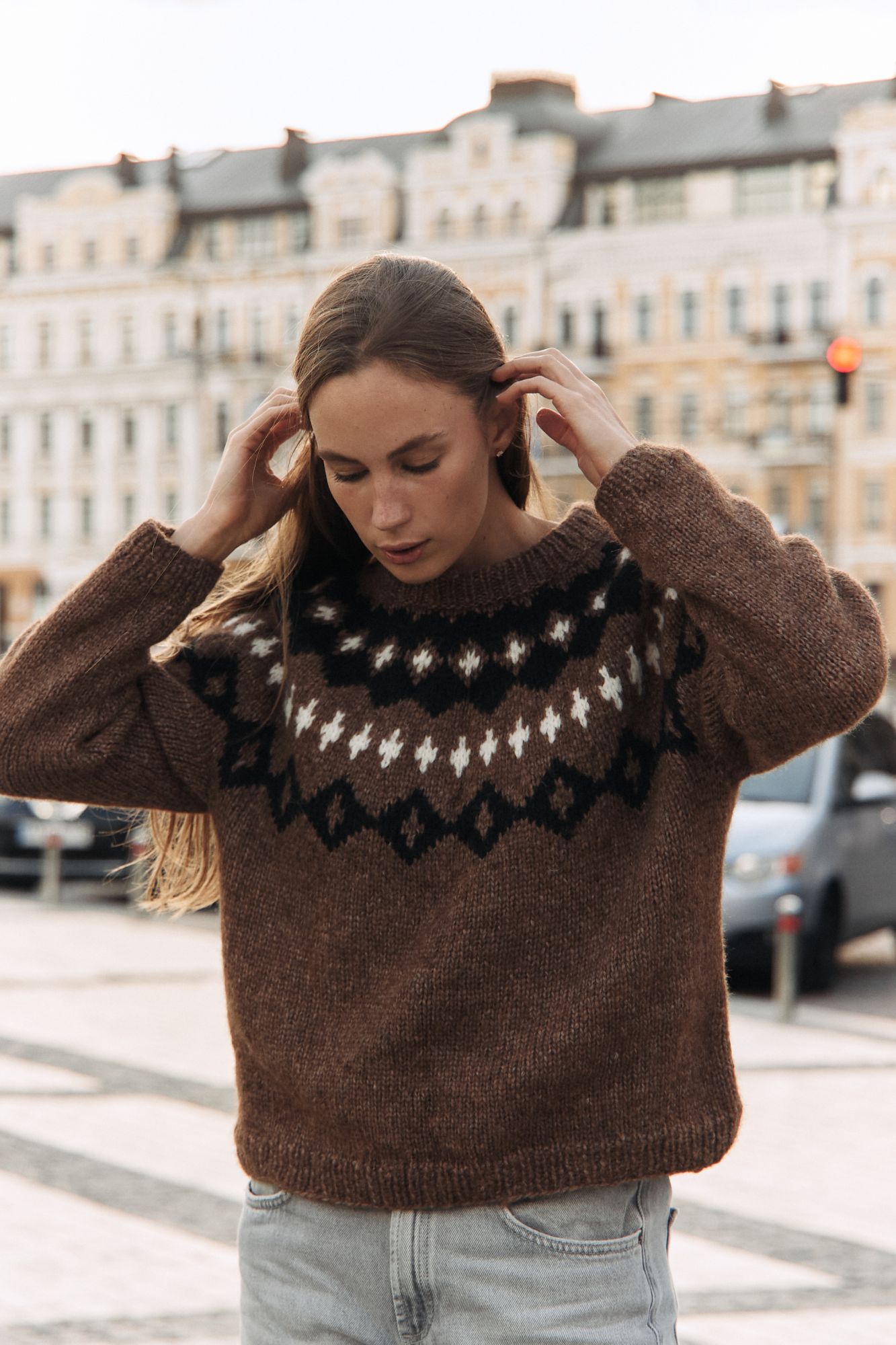 Коричневий светр з альпаки з акцентним узором